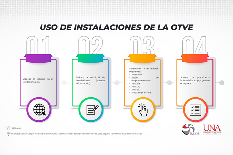 La OTVE cuenta con diferentes instalaciones que pone a disposición de los proyectos de Vinculación Externa Remunerada y de la Comunidad Universitaria en general, a saber: